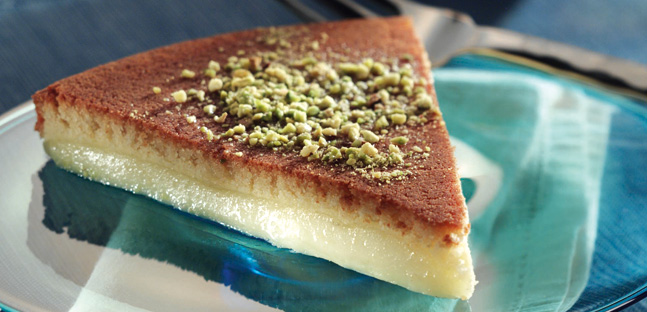 Aish El Saraya is a rich, syrup-soaked bread pudding topped with thick ashta cream and crushed pistachios. It has a soft texture, and the combination of fragrant syrup and creamy topping creates a balanced sweetness. It’s popular in Lebanon, Syria, and Egypt, often served on special occasions.